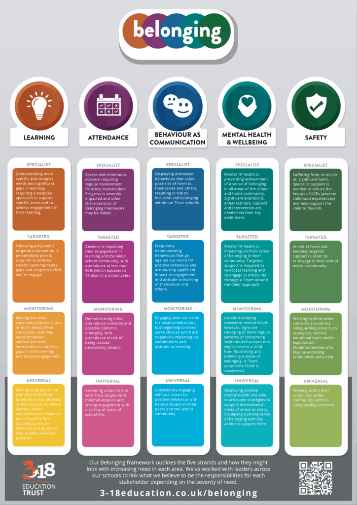 At The 3-18 Education Trust, we have developed a Belonging framework support in a timely manner while also ensuring that students comprehend their personal responsibilities throughout their educational journey and broader life experiences.
