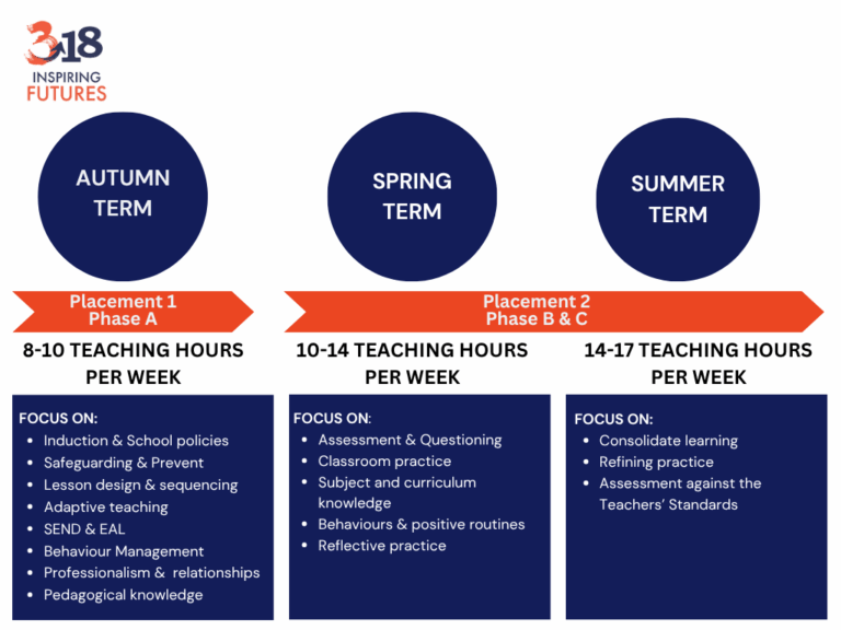 The graphic below illustrates a gradual increase in teaching and key areas of focus through the PGCE programme